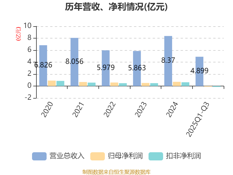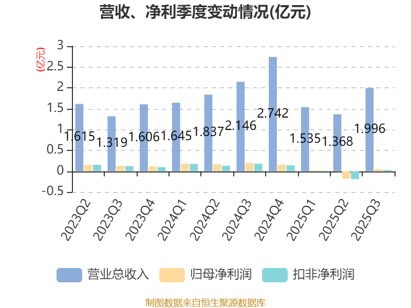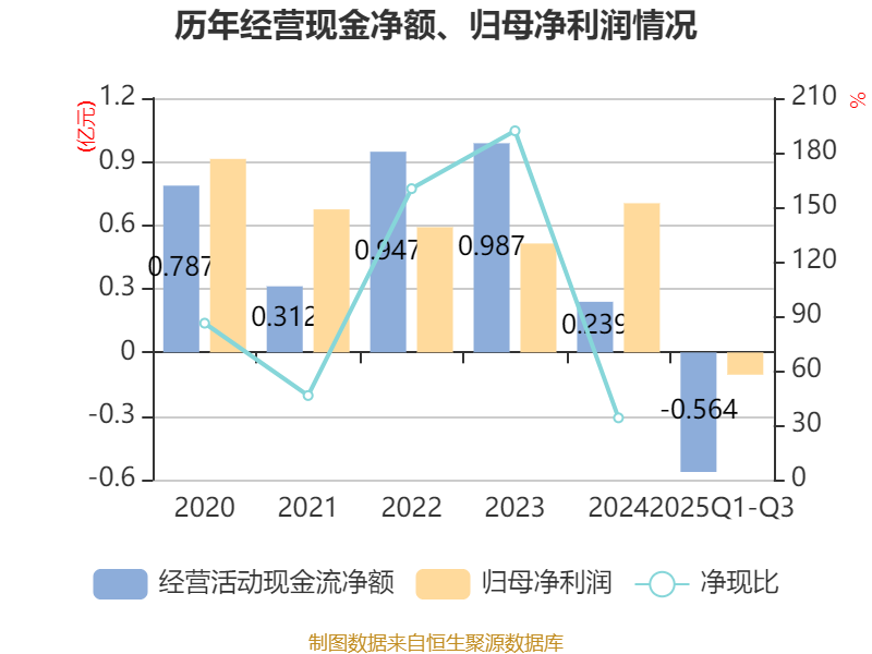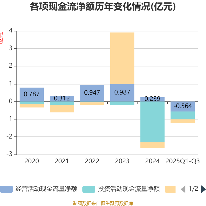 2025年前三季度,公司经营活动现金流净额为-5642.96万元,同比减少7238.89万元;筹资活动现金流净额-2261.13万元,同比减少184.73万元;投资活动现金流净额-4458.62万元,上年同期为-2.07亿元。